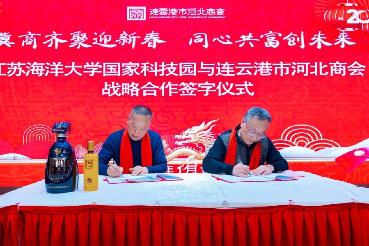 为积极推动江苏海洋大学、连云港市河北商业联合会(以下简称河北商会)产学研合作、人才合作、科技成果转移转化,助推产业链群发展、科技创新,发挥大学科技园促进民营经济、商会经济发展的作用,双方于2024年1月13日下午在云台宾馆举行了江苏海洋大学国家大学科技园与连云港市河北商会战略合作签字仪式。
