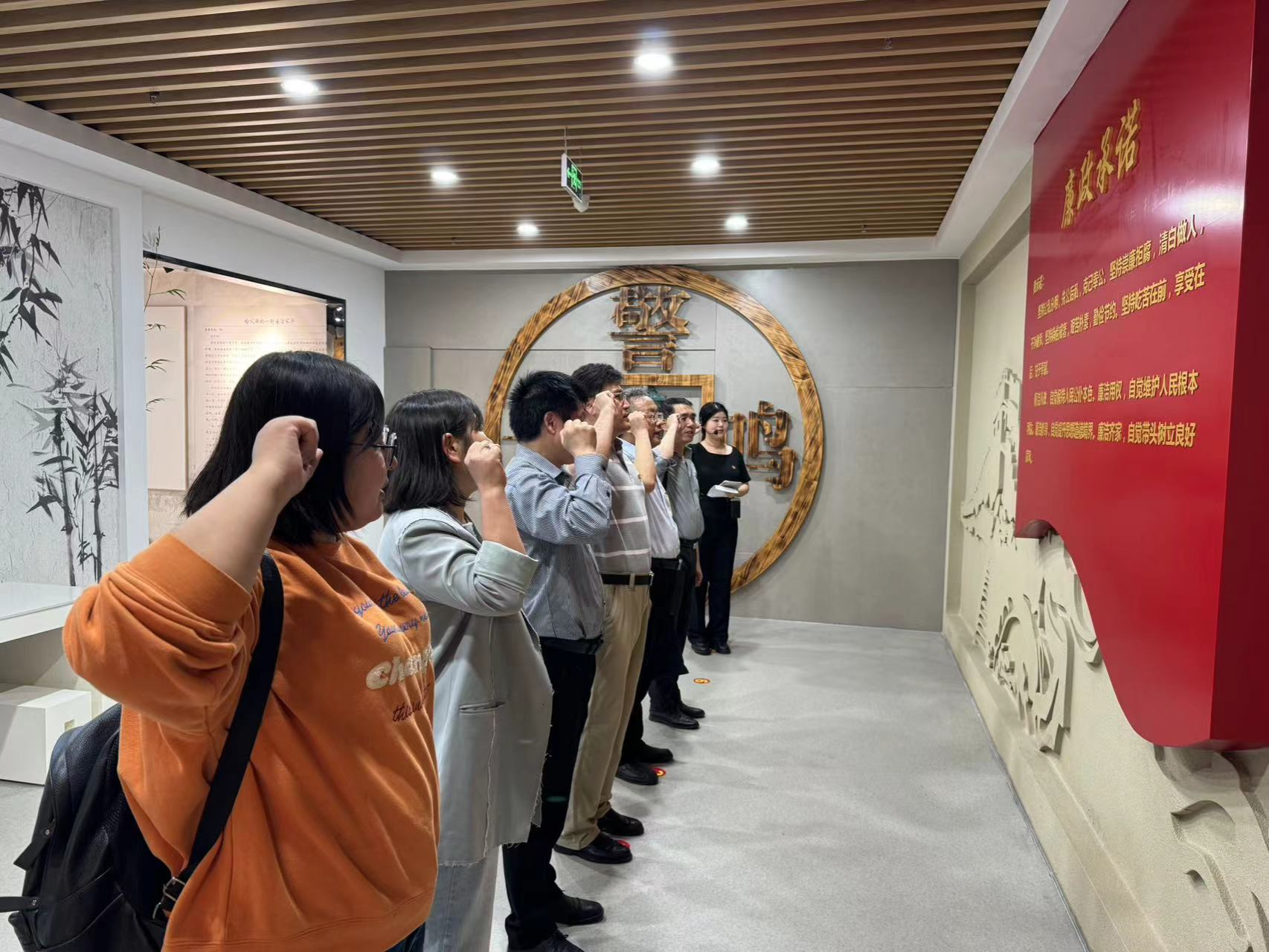 在讲解员的解说和带领下,全体成员先后参观了政治铸魂、以案为鉴、纪法课堂、家风传承四块教育展区,通过聆听讲解、观看图文视频等形式,全方位、多角度、立体式地详细了解了中国共产党反腐倡廉历程、集体学习了典型案件通报,全体人员表示深受警醒。活动上马超强调,党员干部要紧绷拒腐防变的思想之弦,坚持以如临深渊、如履薄冰的心态,在无人之时常自律,于细微之处常自省,更要算好“七本账”,守牢“五道关”。最后,全体成员高举右拳在廉政承诺墙前进行了庄严的宣誓。